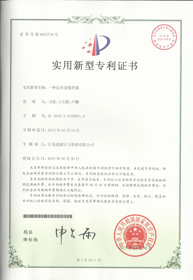 江蘇進源壓力容器有限公司自主研發的“一種油砂分離槽”、“一種反應釜攪拌器”、“螺旋板換熱器”、“一種高效節能蒸發式冷凝器”等四項創新成果,均獲得國家知識產權局專利授權,專利期限為十年。另外申報的15項發明專利也被國家知識產權局受理。